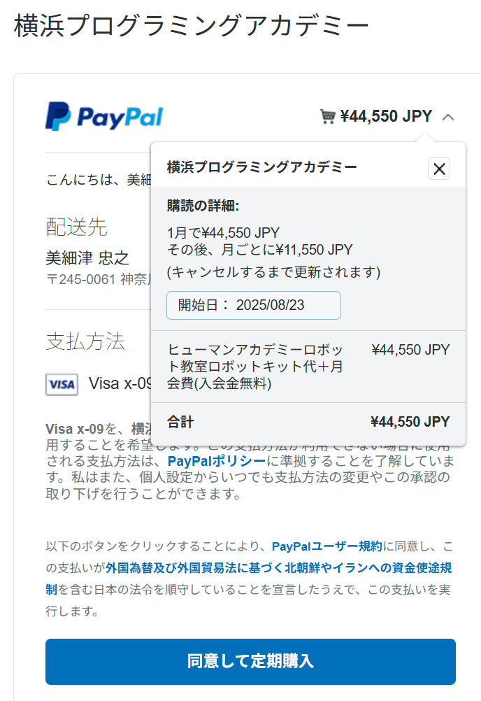 初回の支払いはロボットキット代 33,000円(税込)が別途必要となり、合計44,550円 (税込)となります。